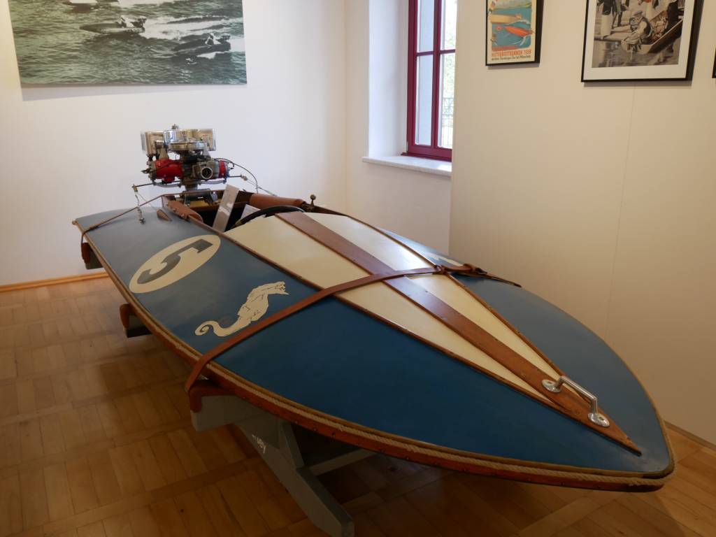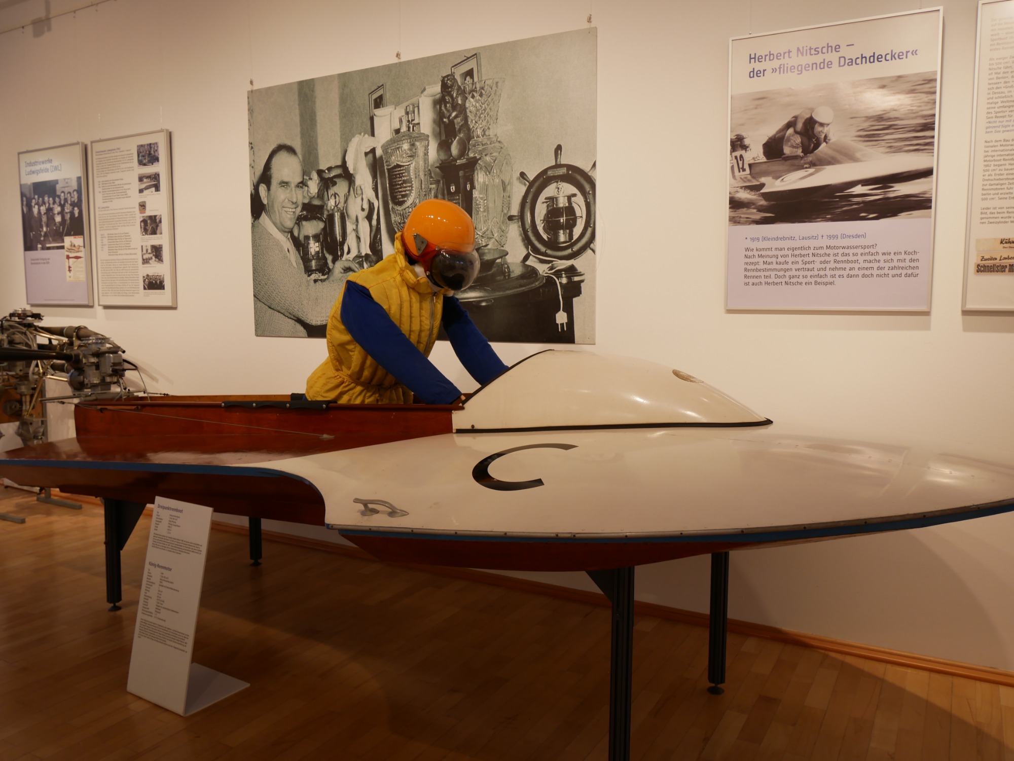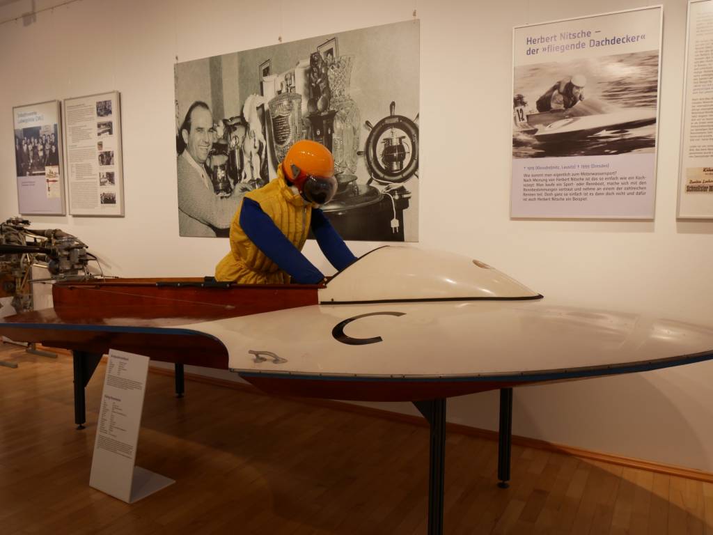 Olaf Koenig, Sammler und Kurator der Ausstellung, selbst Rennbootfahrer und DDR-Meister, führt sie durch die Ausstellung und hat spannende Geschichten rund um den Rennboot-Motorsport in den DDR Jahren zu erzählen.
