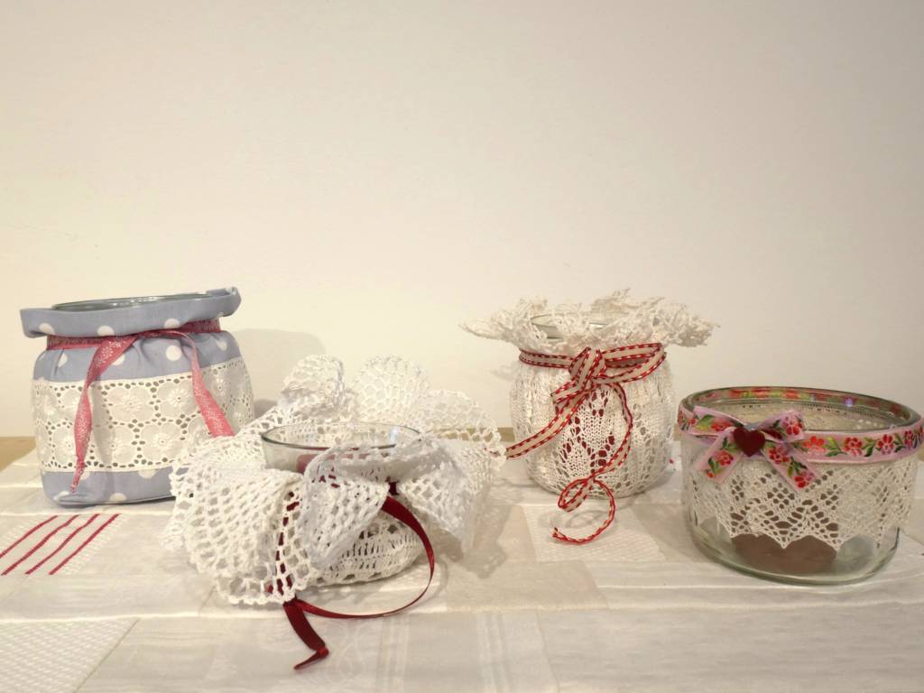 für Erwachsene: Brotbeutel aus schönen Siebdruckstoffen (Kosten: 6,00) oder Windlichter aus alten Spitzen und Borten (Kosten: 3,00)