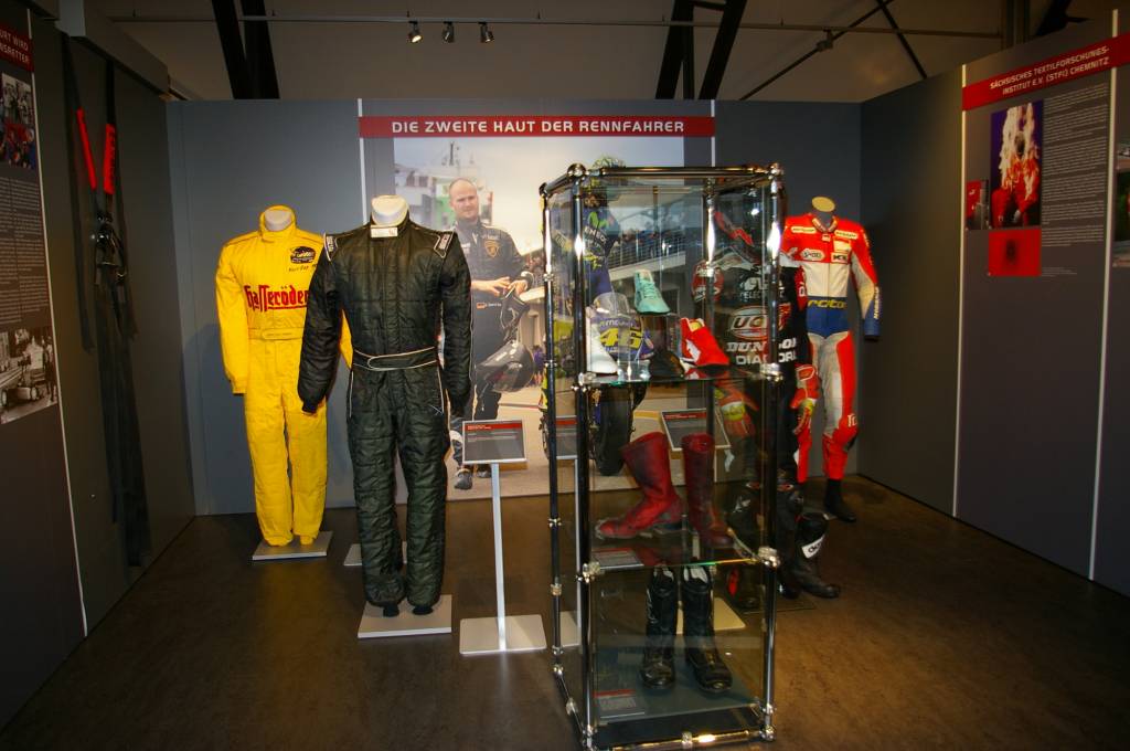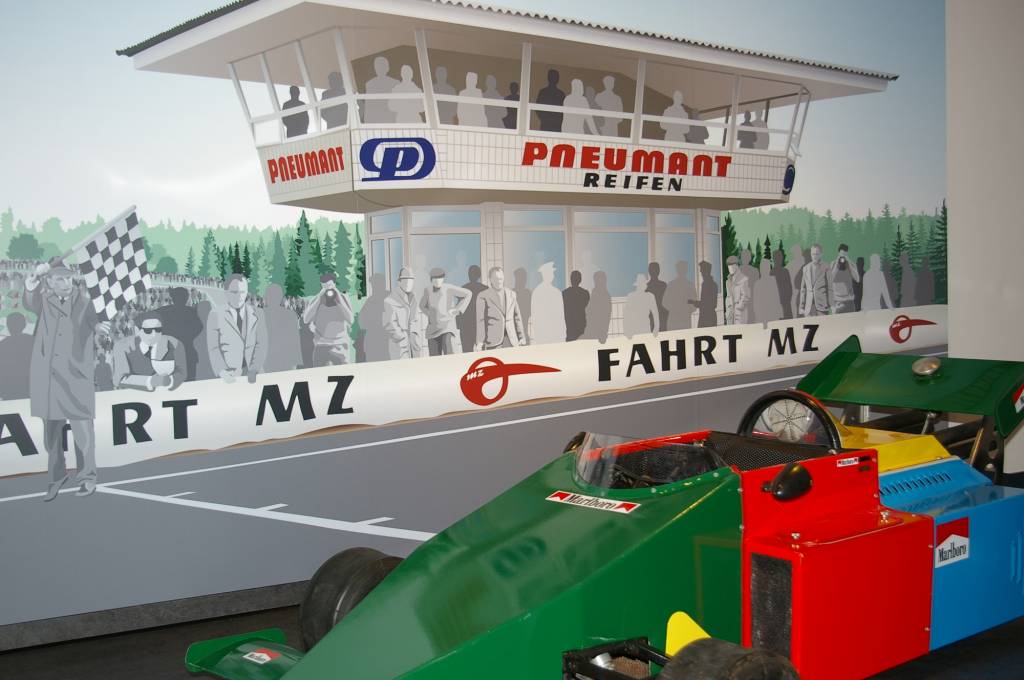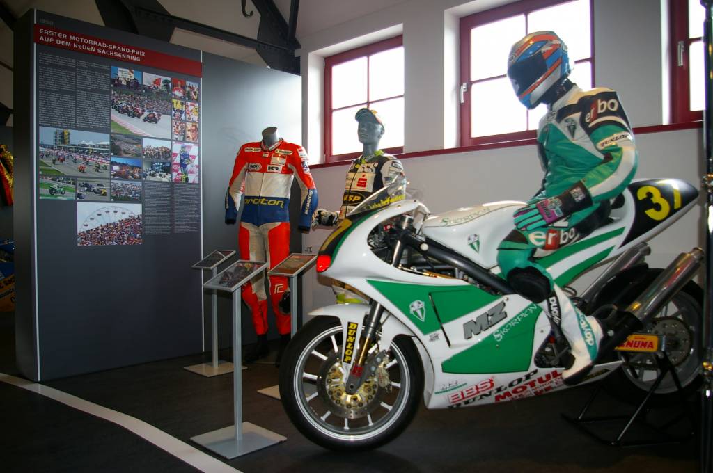 30 Motorräder dokumentieren die technische Entwicklung der Rennmaschinen von den 1930er Jahren bis in die Gegenwart – darunter Namen wie Ifa-DKW, BMW, Bianchi, Yamaha, Suzuki, Ducati, Honda, Montesa und natürlich MZ in zahlreichen Varianten. Der DDR Rennwagen MT 77 steht als herausragendes Beispiel für die Zeit der Autorennen in der" Formel 1 des Ostens" auf dem Sachsenring.