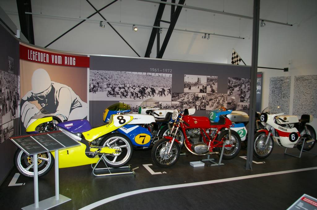 Rennprogramme, Plakate, Siegerpokale und Siegerkränze, Rennbekleidung und Helme begleiten die chronologische Entwicklung der über 90-jährigen Rennstrecke. Neu hinzu gekommen ist ein Kinobereich, in dem vier Filme von den Anfängen der Rennstrecke 1927 bis in die heutige Zeit auszuwählen sind.