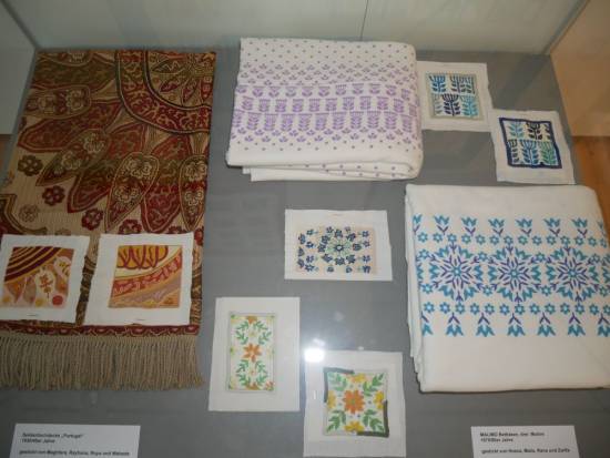 In Zusammenarbeit mit dem Stickprogramm GULDUSI der Deutsch-Afghanischen Initiative e. V. wurden von afghanischen Frauen zehn verschiedene Motive nach Vorlagen aus unserer umfangreichen Mustersammlung nachgestickt. Sie haben den Kanon europäisch - westlicher Ornamentik aufgegriffen und in ihrer jeweilig eigenen Sticktechnik umgesetzt. So wurde ein Tischdecke aus den 1930er Jahren mit einer deutschen Interpretation von orientalischen Mustern von den Stickerinnen mit eigenen Ornamenten ergänzt. Oder die Stickerin Morsal fand nicht die Vorderseite sonder die Rückseite eines unserer Möbelstoffmuster interessanter. Das nur in blau ausgeführte Blumenmotiv auf MALIMO-Bettlaken wurde auch farbig umgesetzt. Entstanden sind einmalige, zauberhafte Stickereien in sehr unterschiedlicher sowie persönlicher Neuinterpretation unserer deutschen Mustervorlagen.